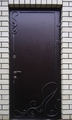 Дверь изготовлена из стали толщиной 2 мм, снаружи и изнутри нанесено порошковое напыление черного цвета с антикоррозийными свойствами. Кованные элементы придают двери изысканный вид. В стандартный вариант комплектации входят два врезных замка с разными механизмами и три петли диаметром 20 мм. Дверной блок оснащен противосъемными блокираторами. Модель подойдет для установки в загородном доме.