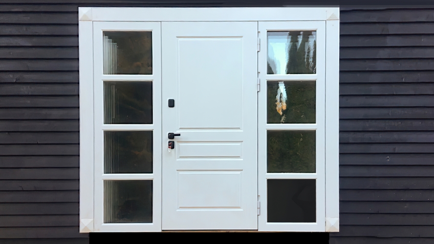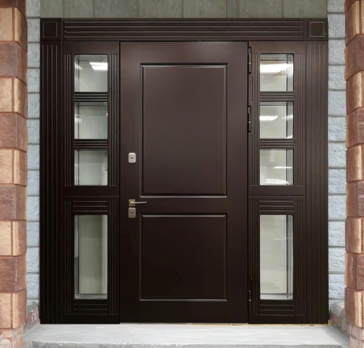 Парадная дверь с карнизом, стеклопакетами, отбойниками
